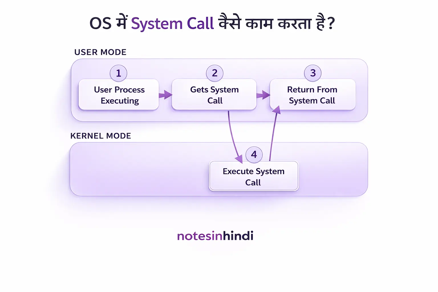 System Call इन दोनों modes के बीच switch करवाता है, जिससे system secure और stable रहता है।